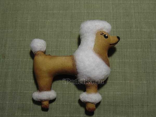 По готовой форме собачки, рисуем карандашом на ткани, сложенной в два слоя. По контуру делаем строчку. Можно прострочить на швейной машине, а также зашить иглой с ниткой швом «вперёд иголка». Только в любом случае нужно оставить свободным отверстие для выворачивания. И когда всё прошито, нужно вырезать по контуру фигуру, оставляя припуск от проложенной строчки. А у свободного отверстия лучше добавить больше припуска.