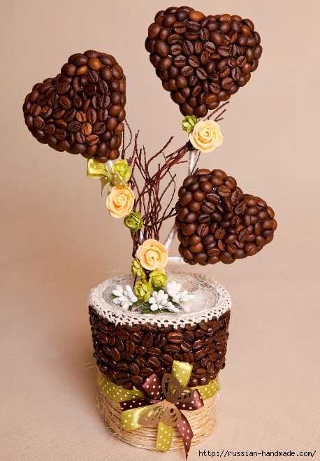 Аналогично можно сделать забавного кота для панно. А еще из кофе получаются очень красивые топиарии и много других поделок, о чем мы уже подробно рассказывали в публикации, знакомящей с кофейным хобби.