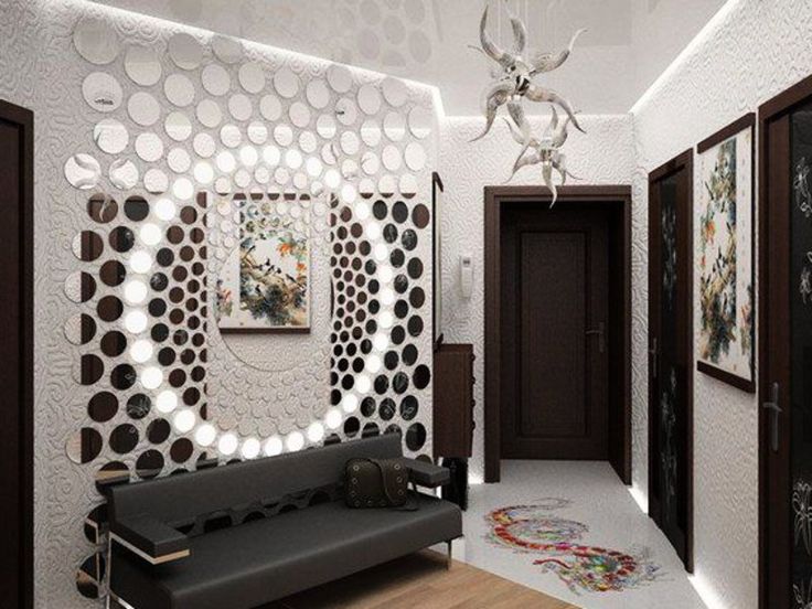 Вместо картин и постеров на стену можно повесить несколько небольших зеркал в рамах из какого-нибудь одного материала, например, дерева, или без рам. Формы и размеры зеркал могут отличаться.