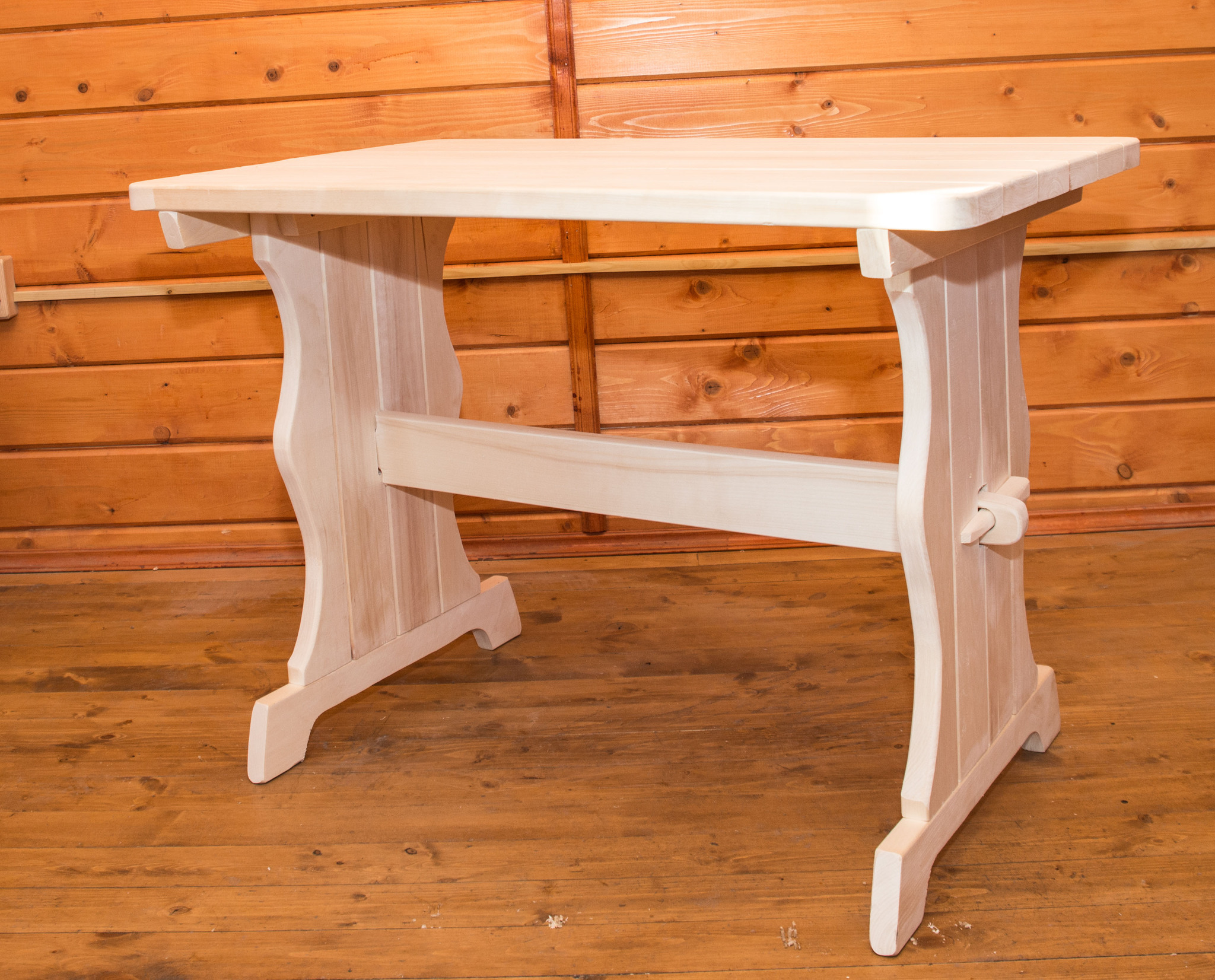 Не так уж и сложно самостоятельно изготовить кухонную утварь. Можно начать с небольшого кухонного стола из сосны. Ножки проще всего купить готовые, сосна — самый бюджетный вариант. Рабочую поверхность проще подобрать под планируемые размеры. Останется только, в прямом смысле, поставить стол на ноги.
