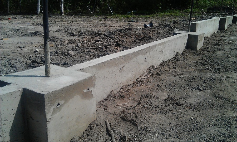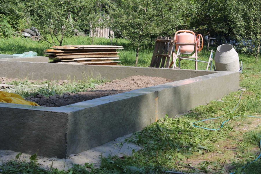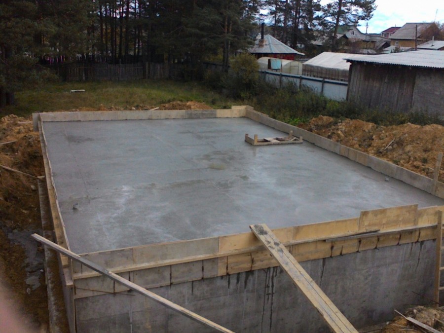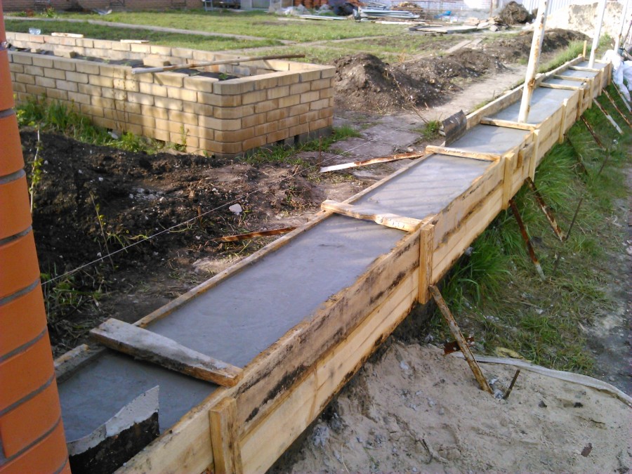 Заливать надо слоями. При заливке бетон надо утрамбовывать убирая пустоты. В жаркую погоду, после каждого рабочего дня фундамент необходимо, накрывать пленкой для равномерного просыхания.