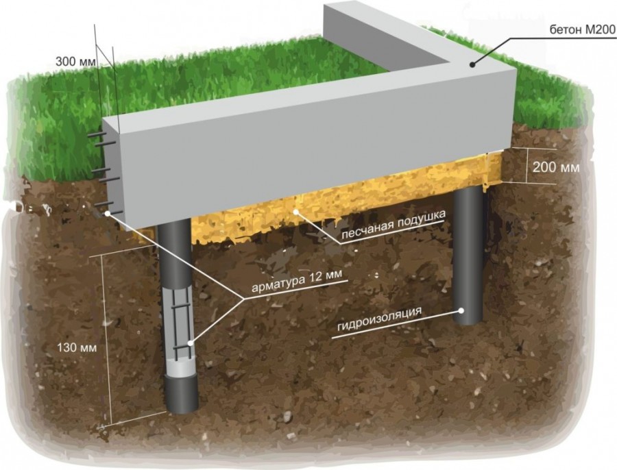 Столбчатый: бурят или копают ямы глубиной ниже уровня промерзания. Располагают их по углам дома и на расстоянии 1-1,5 метра между собой. Столбы по верху соединяются поясом 40*40 см из железобетона.