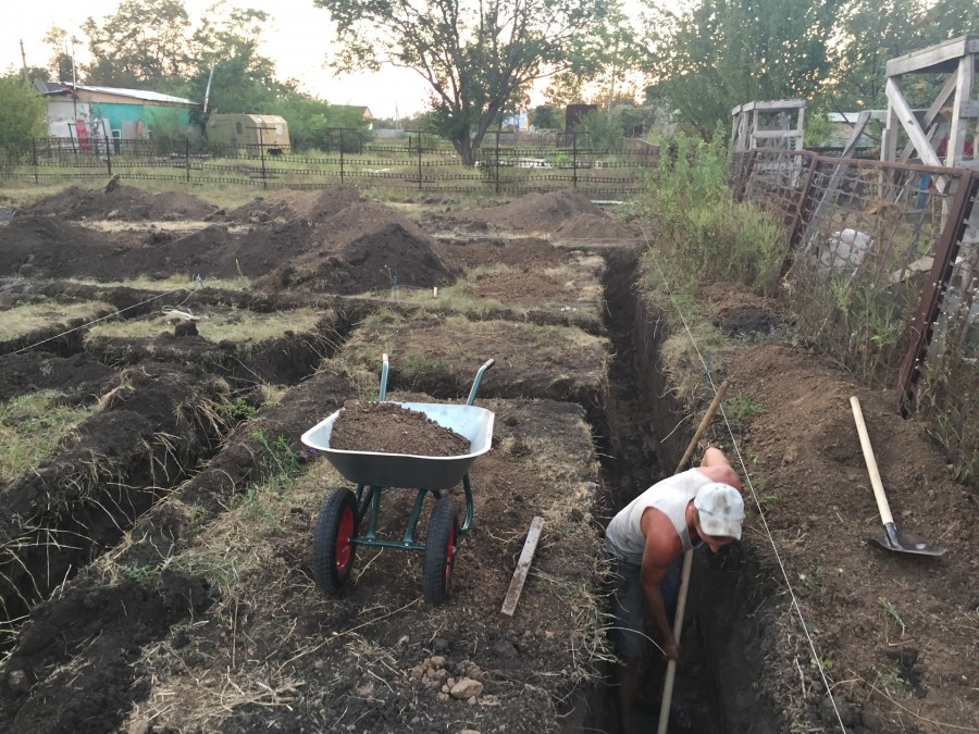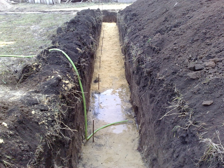 Будете копать траншею сами или наймете экскаватор решать только вам. Ширина траншеи делаем 30-60 см, глубина от региона колеблется между 80 см до 1,6 метра. Все очень индивидуально, много зависит от перепада высот на участке. Подушка под основание 10-15 см песка, потом 15-20 см не крупного щебня, обязательно хорошо утрамбовать.