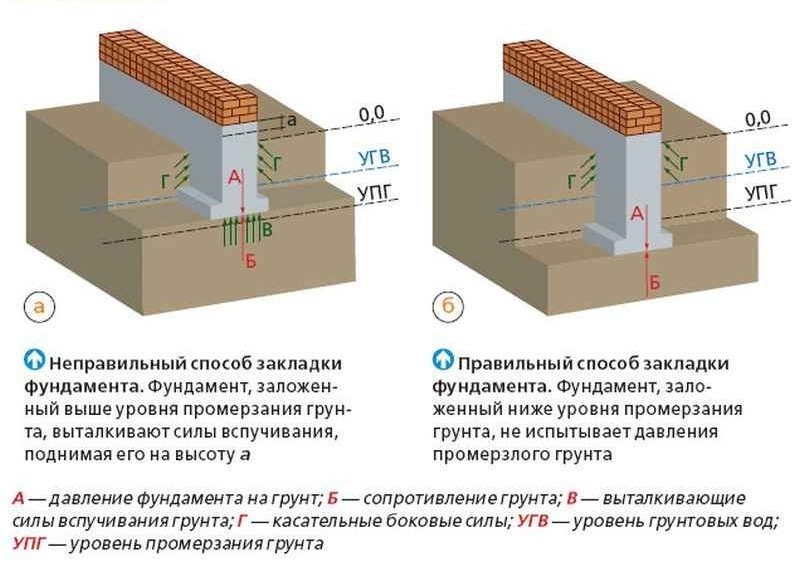 На первом технология строительства фундамента, а также выбор глубины зависит от двух факторов: глубина промерзания и глубина, на которой располагается вода. Второй же не требует большой глубины.