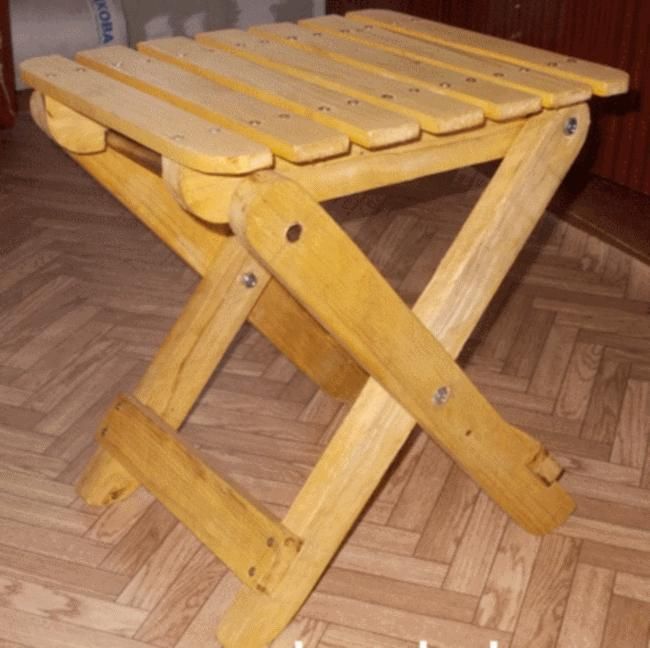 Каркас будущего стульчика готов. Сделать его более удобным в использовании можно прикрепив в качестве сиденья гладко отшлифованные доски или лист фанеры. Сверху на него кладется мягкая сидушка. Для спинки и столешницы используются небольшие гладкие дощечки.