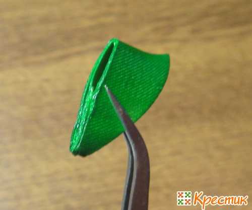 5. Кончики ленты аккуратно обрезать и слегка опалить над огнем, быстро пронеся ленту над пламенем. В результате этого края листочка должны скрепиться между собой.