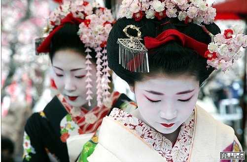 Традиционная прическа гейши может нести на себе колоссальное количество шпилек, пышных бантов, цветов, зонтиков и гирлянд.