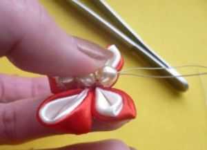 Подобная техника канзаши немного сложнее, так как материал достаточно скользкий, поэтому без помощи пинцета не обойтись: