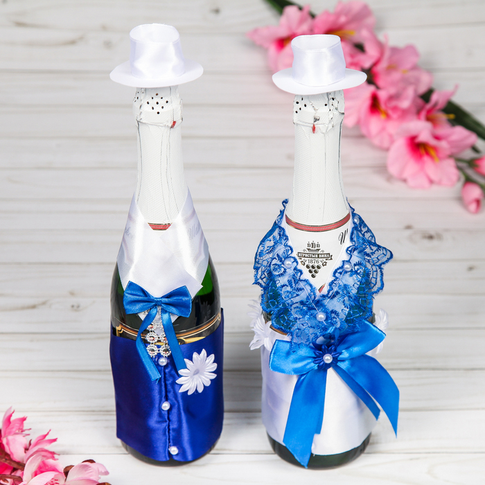 Такое украшение шампанского на свадьбу своими руками сделать очень просто. Понадобиться только стрейчевый бархат, нитки, бумага и карандаш, а также две бутылки, декор.