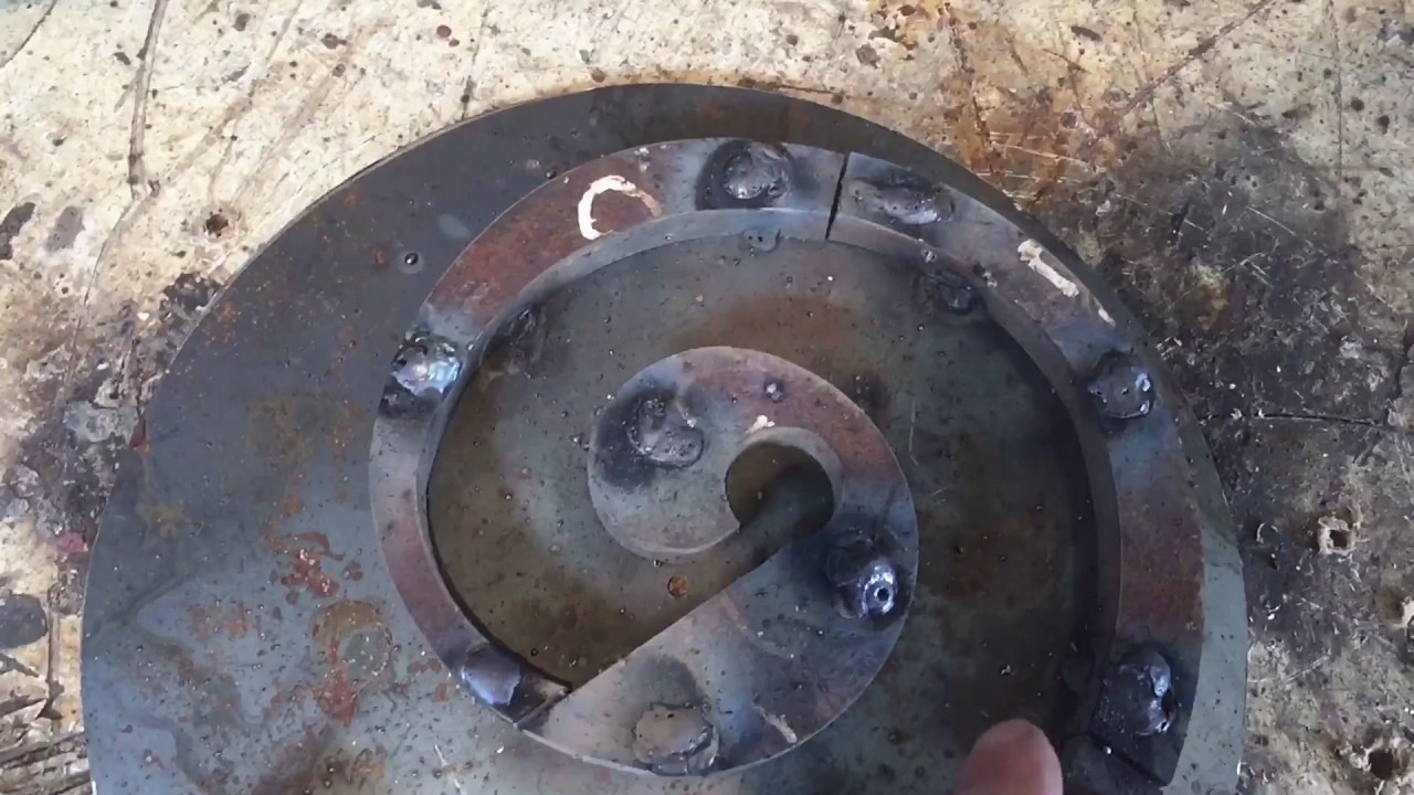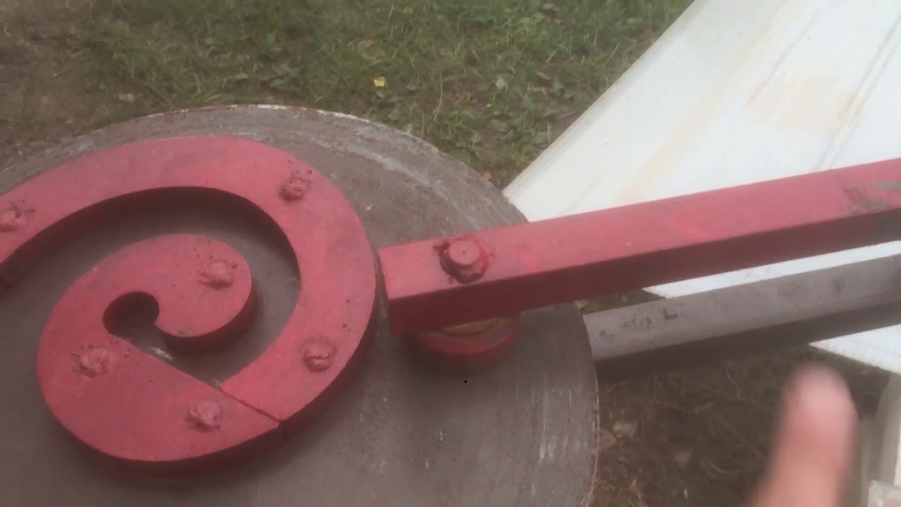 Теперь я начал сборку, приварил маховик к внутренней части ступицы, к ней же приварил уже изготовленную опору из флянца (от газовых труб) тощиной около 18 мм и трубы диаметром 20 сантиметров (точно уже не помню), опора у меня крепилась к забетонированному в землю столбу и станок я решил сделать съемный , так как у меня не было желания и материала делать для него громоздкую раму которая потом занимала много место в гараже.К внешней части ступицы я приварил ручку которая была собрана в основном из полос толщиной 8 мм у основания ступицы ,а ближе к ручке труба на ней я сделал телескопический механизм с фиксатором на котором в конце установлен подшипник котрый уже будет давить на на заготовку и огибать ее вокруг кондуктора (улитки).