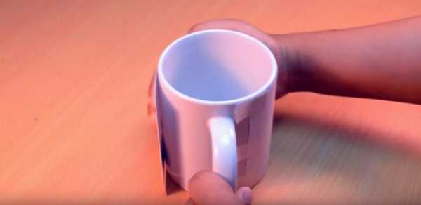 На двухсторонний скотч (обычный может расплавиться) приклеиваем рисунок к кружке ,чтобы он не съехал во время проглаживания.