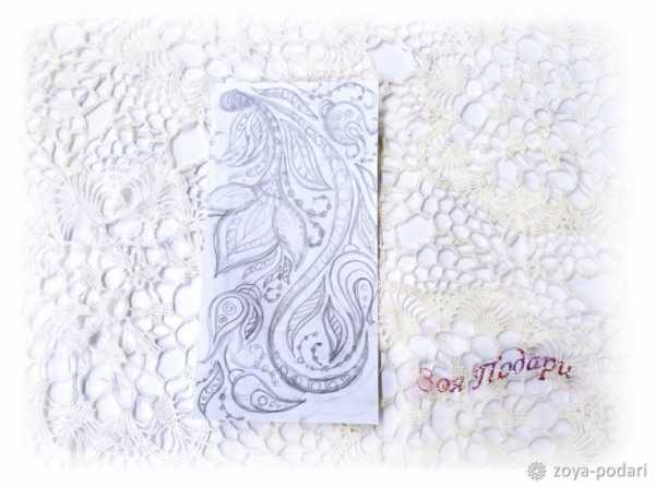 Если вас устраивает эскиз, то маленькими ножницами вырезаем центральный или самый крупный элемент. Аккуратно прикладываем его на сухую поверхность чехла и белым контуром по срезу рисунка наносим точки, стараясь выдерживать расстояние между ними. Если линия получилась кривой или точки слились, то сразу же ватной палочкой вращательным движением стираем это место.