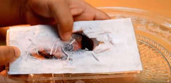 - Дать футляру высохнуть в течение 2-х часов. Все это время внимательно следить за ходом отвердевания смолы, а при малейших подтеках немедленно вытирать их ватной палочкой, смоченной в ацетоне.