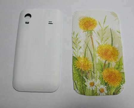 По сухому фону еще раз проходимся наждачкой и убираем все неровности. Вырезаем из салфетки понравившийся узор по размеру телефона и прикладываем к телефону.