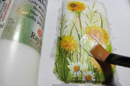 Мягкую широкую кисть окунаем в клей ПВА и затем аккуратно проходимся ею по салфетке, слегка прижимая ее к телефону. Это самый сложный этап в декупаже, т.к. салфетку надо приклеивать так, чтобы не было неровностей и пузырей, а сама салфетка от намокания не расползлась. Излишки клея надо аккуратно промокнуть мягкой тряпочкой и оставить салфетку до полного высыхания. Потом наждачкой аккуратно проходимся по образовавшимся неровностям.