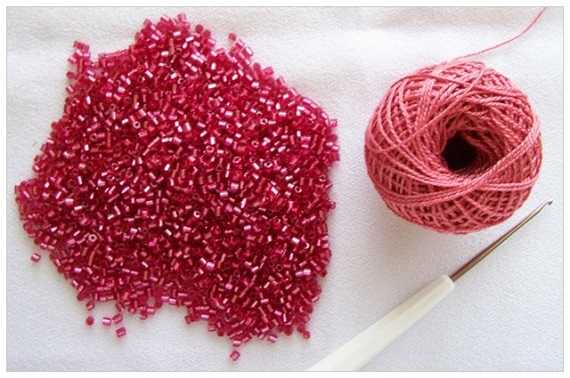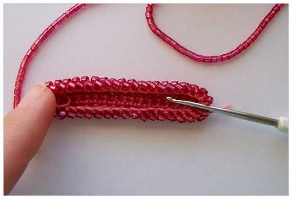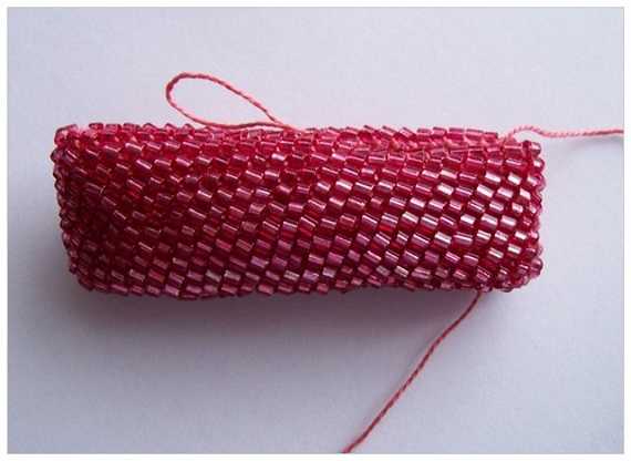 - Теперь необходимо набрать на нить для плетения как можно больше бисера и приступить к непосредственному созданию чехла. Для этого просто продлить вязку, добавляя бисеринки в каждую присутствующую петельку.