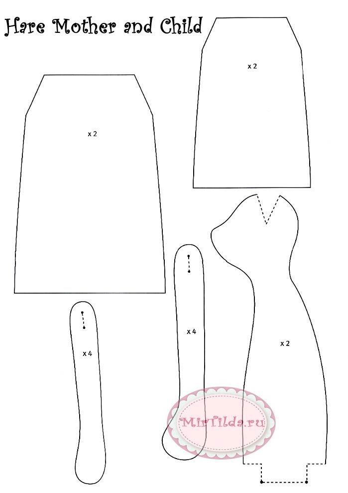 Сначала нужно выбрать выкройку зайца тильда. На верхнем рисунке он состоит всего из трех элементов — туловища, рук и ног. Также вам нужно будет отдельно распечатать ушки будущего зайчика. На изображении ниже, помимо самой игрушки, есть еще и рисунки одежды. Уши на этой схеме тоже есть, и, как могут заметить читатели, они там не только по отдельности, но и цельные.