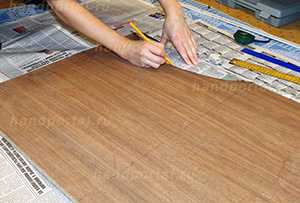 Приклеиваем декоративную кромкуЕсли лента по ширине больше торца плиты, то лишнюю часть обрезаем острым ножом, а срез ленты аккуратно промакиваем морилкой (можно использовать ушную палочку).