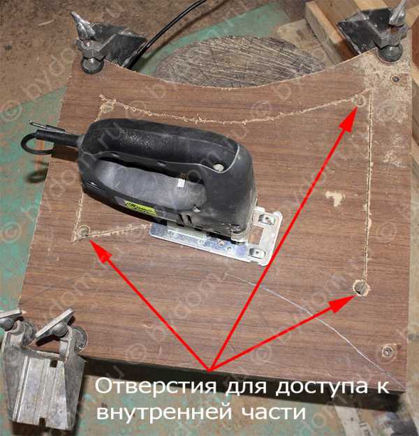 Чтобы получить доступ к внутренней части детали, необходимо в ее углах просверлить отверстия большого диаметра, через которые лобзиком можно выпилить всю необходимую часть плиты.