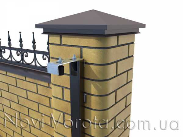 Одна часть пластины заводится между нащельником и кирпичной кладкой столба и приваривается.