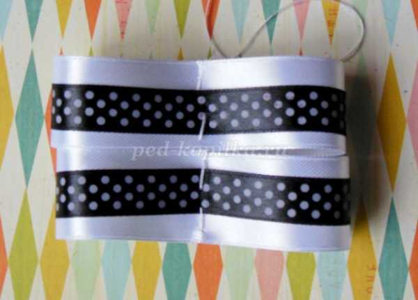 - Делаем сгиб посередине первого отреза черной ленты, затем подгибаем оба конца отреза к центру, в форме бантика. Закрепляем концы несколькими швейными стежками.