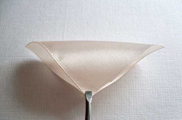 Свернем лепесток вдвое. Атласная сторона должна быть внутри.