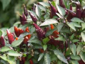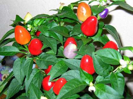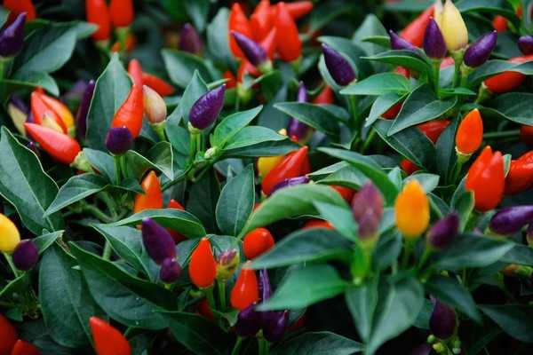 Плоды декоративного перца съедобны, имеют жгучий вкус и могут быть использованы как пряность. Сортов этого растения семейства пасленовых выведено великое множество. Но самые интересные из них – невысокие, вырастающие не более чем на полметра, с густой листвой и россыпью разноцветных перчиков. Окраска плодов варьируется от желтых, ярко-фиолетовых и красных, до почти что черных. Форма их тоже может быть разной: заостренной или тупоносой, изогнутой и грушевидной, цилиндрической или имеющей вид почти правильного конуса.