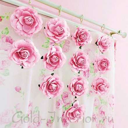 - То же самое относится к вязаным цветкам. Мы привыкли видеть их лишь на одежде. Но, по аналогии с предыдущими, ничто не мешает использовать их в оформлении помещения. Например, можно сшить шторы своими руками и усеять их искусственными цветами для украшения интерьера, как на фотографии ниже. Это не элементы праздничного декора, а часть повседневной обстановки. Если хотите, чтобы цветы сильно не бросались в глаза – просто сделайте их из той же ткани, что и занавески, как в указанном примере.