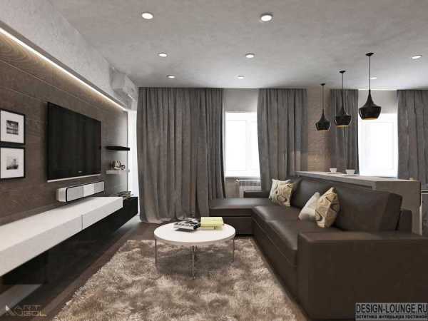 Шоколадный цвет в интерьере гостиной с совмещенной кухней