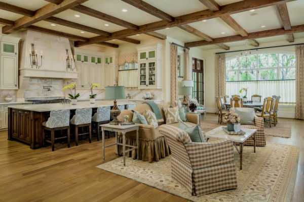 Планировка загородного домика и городской квартиры заметно отличаются. Но обычно кухня и гостиная в них располагаются недалеко друг от друга. Так почему бы их не объединить? Получится пространство в едином стиле с различной функциональностью.