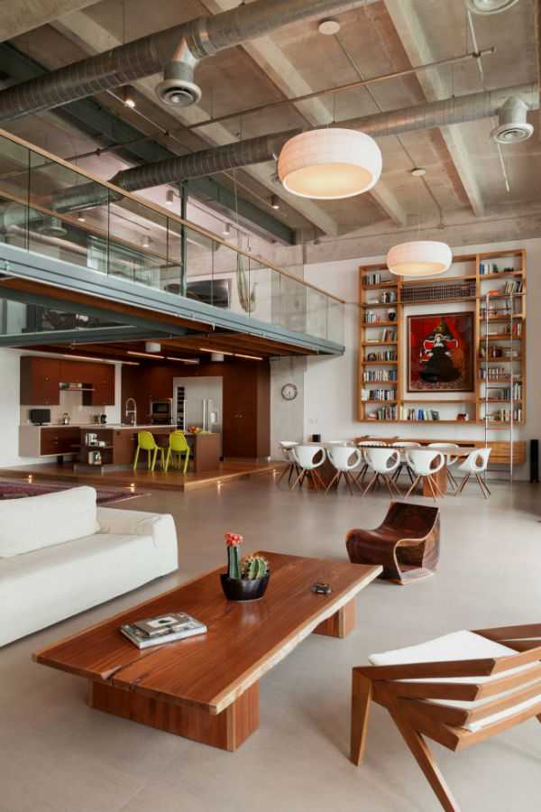 Дизайнеры продумали не только разноуровневость потолков, но их цветовое решение. Поверхность имитирует бетон и поэтому отлично сочетается со светильниками из необработанных железных прутьев, а также со сверкающими хромированными лампами. Вся мебель имеет правильную рациональную геометрию, начиная от барной стойки, кухонной поверхности и заканчивая мягким уголком.