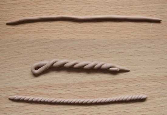 - Из белого или бежевого пластилина скатываем тоненькую колбаску и скручиваем ее на манер веревки – получилось замечательное кремовое украшение.