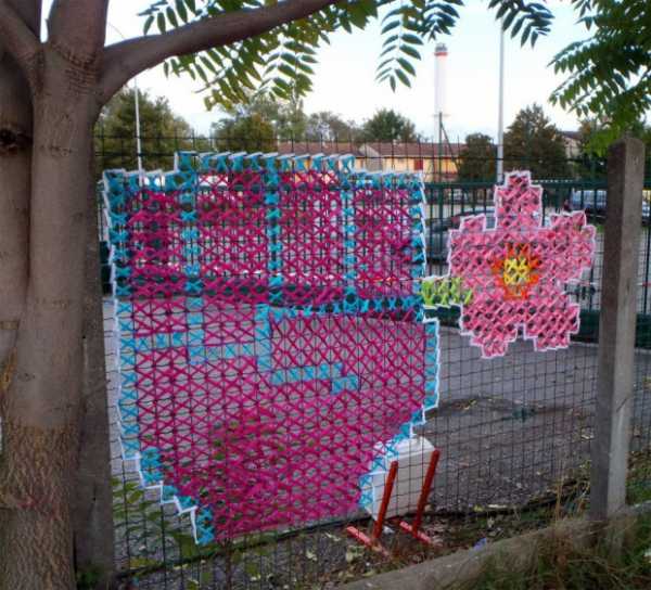 Есть направление в уличном искусстве, которое ассоциируется с вышивкой крестиком и пиксель-артом. Ячеистая сетка-рабица станет идеальной основой для плетения узоров капроновыми веревками, создания рисунков цветными изолентами, скотчем и другими, подходящими стилю материалами.