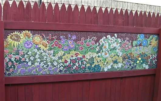 Отличным решением станет реставрация поверхности ограды с использованием мозаики. Не нужно думать о дорогостоящих промышленных вариантах. Сделайте мозаику самостоятельно. Ее роль можно возложить на битый фарфор, керамическую плитку, стекло, зеркало или речную гальку. Сюжетный рисунок будущего красивого забора можно сделать небольшим, а дальше вы просто выложите цветными россыпями пространство вокруг него.