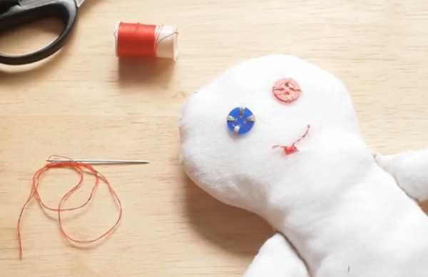 Ротик вышиваем красными ниточками, а глазки делаем из цветных пуговок. По желанию можно сделать волосы из шерсти: