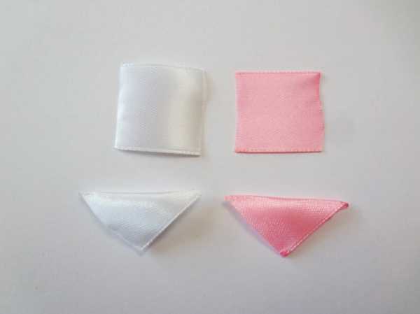 Сначала нужно нарезать ленту. Длина розовых отрезков – 6 см, а белых – 5 см (меняя длину, можно подобрать оптимальный размер цветочков). На пару резинок необходимо по 12 таких отрезков. Чтобы с ними было легче работать, а готовое изделие выглядело эстетично, нужно провести по краям ленты и немного расплавить ее, чтобы не торочилась.