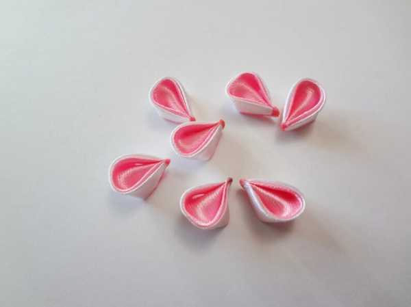 Отрежьте необходимое количество 5 см отрезков белой ленты. После обработки срезов пламенем начните создавать необычные куполообразные лепестки. Расположите отрезок вертикально. Зажмите пальцем центральную часть и изогните верхнюю половину относительно нижней на 90 градусов. Сделайте еще один сгиб в центральной части, чтобы четко совместить 2 половины отрезка. В результате получится двойной лепесток с острым уголком.