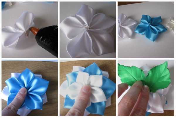 Предложенные канзаши детские заколки мастер-класс с цветочками выполнены в бело-синих тонах, а потому они отлично подойдут для ношения не только в обычные дни, но и в праздники, и в школу. Чтобы сделать декор из скользящего атласного материала, потренируйтесь работать с лентой, главным образом, опаливать ее, ведь это необходимый этап обработки срезов атласа. Достаточно на мгновение дотронуться пламенем зажигалки до торчащих нитей, чтобы заготовки стали более аккуратными.