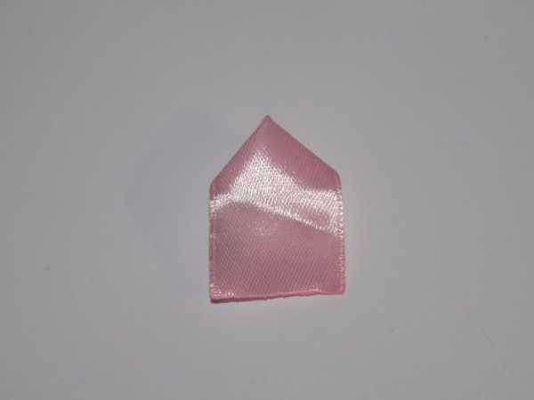 1. Из яркой ленты цвета фуксии в виде больших прямоугольников 2,5*10 см нужно сделать 6 больших лепестков. Расположите прямоугольник горизонтально. Отметьте в верхней широкой стороне середину. Согните вниз сначала одну сторону, сделайте это четко вертикально. Затем таким же способом согните вторую сторону. В результате у вас получится деталь-домик с уголком вверху. По центру обе стороны должны четко состыковаться.