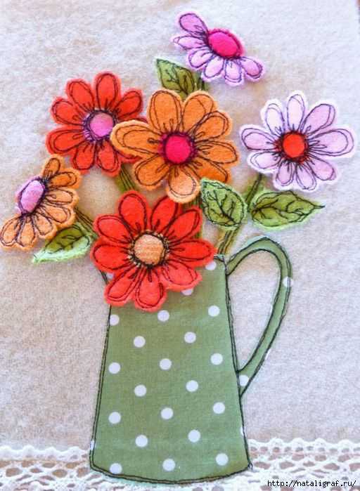 Зато всё, что ниже, можно легко повторить. Уж аппликация-то нам всем хорошо известна. Правда, и здесь на неё взгляд особый. Как сделать — тоже понятно. Главное, внимательно рассмотреть. Здесь фетр правит бал и машинная строчка