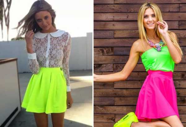 - Кислотные расцветки. Летние мини-юбки отличились яркими и энергичными однотонными цветами. В моде кислотные оттенки салатового, электрик, оранжевого, малинового.