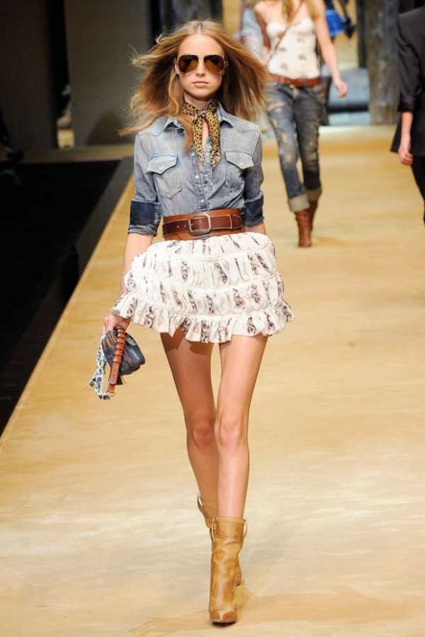 Активные барышни предпочитают джинсовые модели. Эффект состаренной ткани – самый актуальный тренд. Приветствуется необработанный нижний край, присутствие потертостей, неравномерность окрашивания. С безрукавкой либо обычной маечкой такая модель великолепно гармонирует. А любительницы модного эпатажа оценят по достоинству яркие юбки из денима, украшенные заклепками и нашивками. Их представили марки Wrangler, Colin’s, Levi’s.