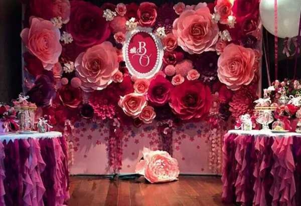 Бумажные цветы делаются не за один день, и чтобы сделать их к празднику, начинать надо за пару месяцев до торжества. Цветами можно украсить потолок, края по бокам сцены на полу, праздничный стол, стулья, арки, денежные деревца, а также ковровую дорожку, если она планируется.