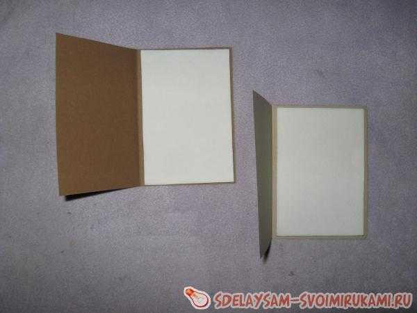 Из акварельной бумаги вырезаем прямоугольники 8,2*12,2 см для внутренней надписи. Двухсторонним скотчем клеим их вовнутрь открытки.