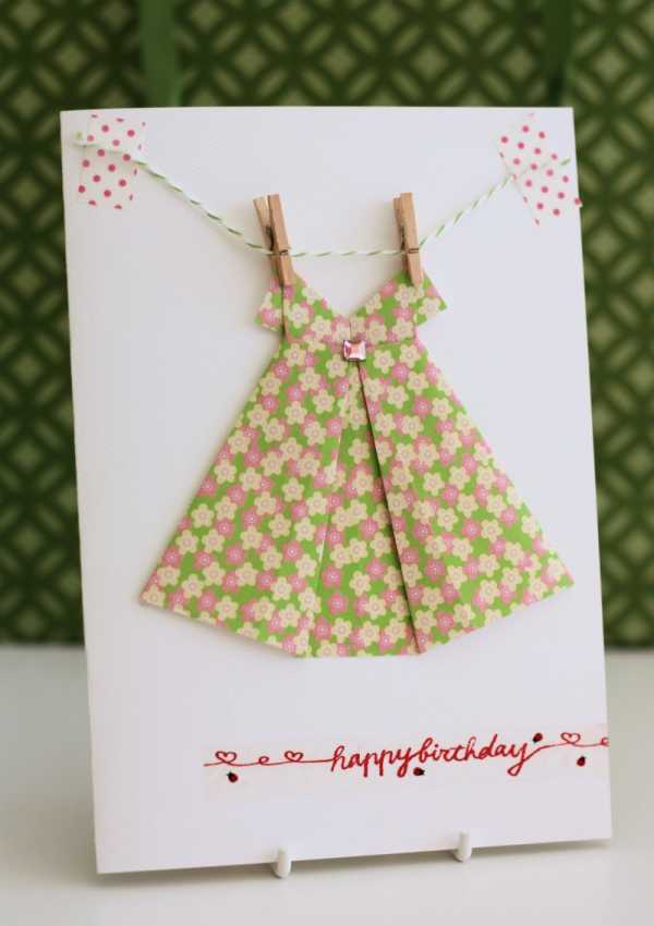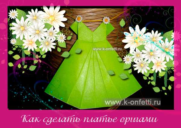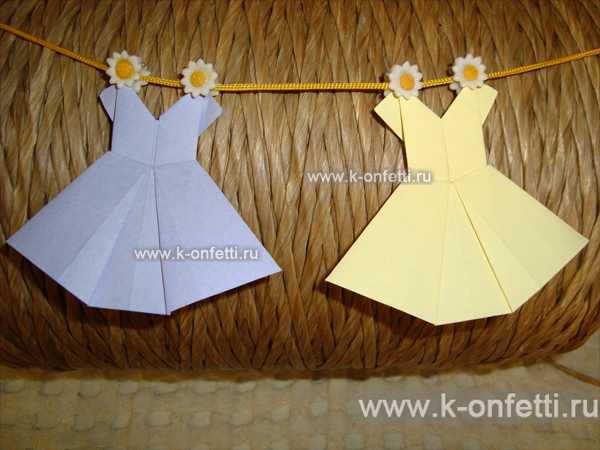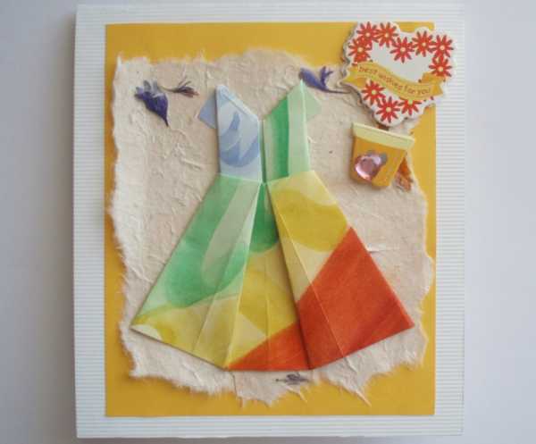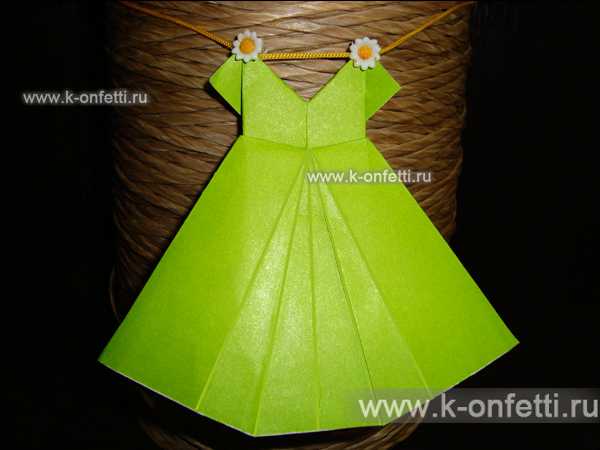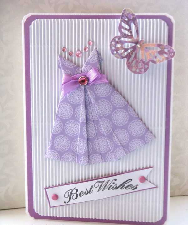 Если придерживаться пошаговой поэтапности изготовления платья-оригами собственноручно, то можно сделать его и основным декоративным элементом, а также главной деталью открытки.