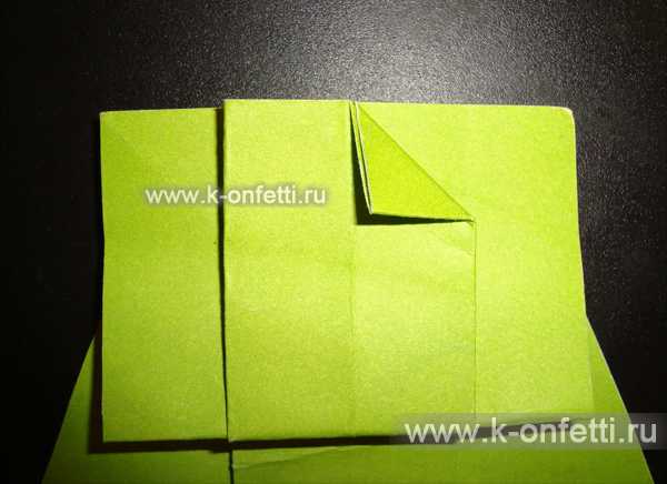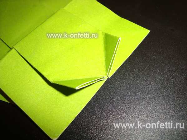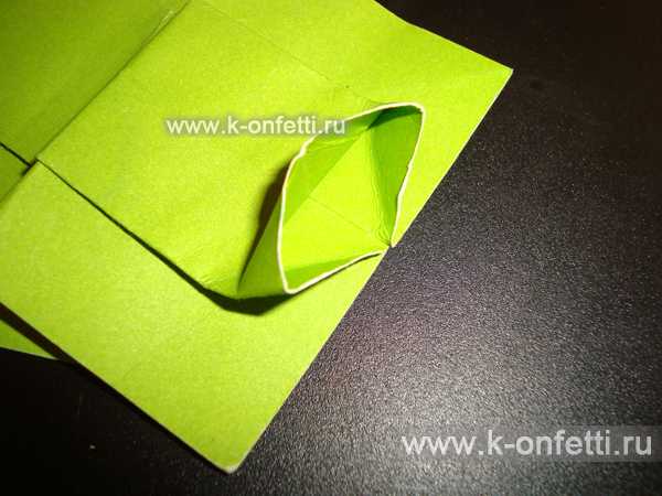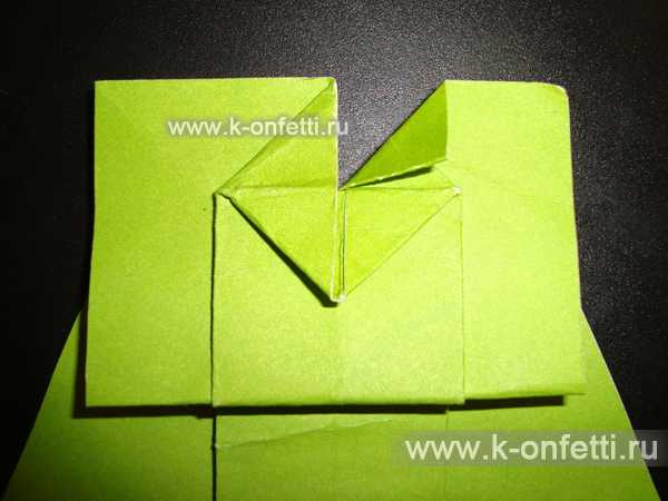 Стороны внешние тоже следует сложить вовнутрь, перевернуть бумагу розовой стороной. Следует загнуть верхнюю часть полученного прямоугольника, создав в верней стороне уголки. Вновь переверните полученную фигуру. Сформируйте углы в верхней части тоньше наполовину, при этом загните бока вовнутрь, отгибая впоследствии по диагонали углы нижней части.
