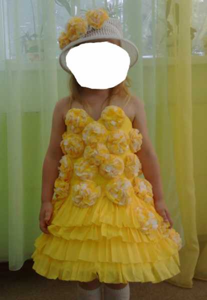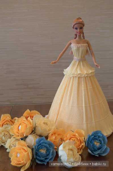 Дальше было белое с цветочками, основа состояла из двух выкроенных ватманов, большой вырез на спине, чтобы удобно одевать, оформила цветами из салфеток, получилось нежное и легкое. По времени на одно платье уходит около недели.