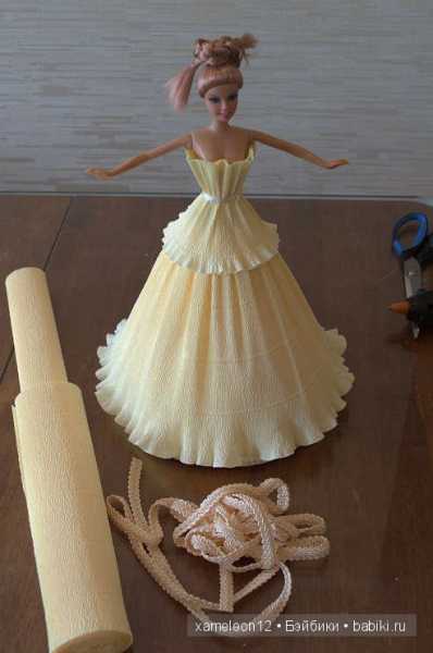 Для начала нарисуем и вырежем конус из картона, надеваем его на куклу как юбку и соединяем края малярным скотчем. Чтобы наша кукла устойчиво стояла, необходимо закрепить ее с помощью пенопласта, либо любого другого подручного способа. Юбку оборачиваем листом гофрированной бумаги. Чтобы юбка получилась пышная, лучше использовать несколько слоев бумаги. Растягиваем края в стороны, как на фото, чтобы получились волны.