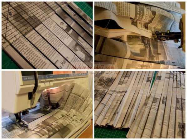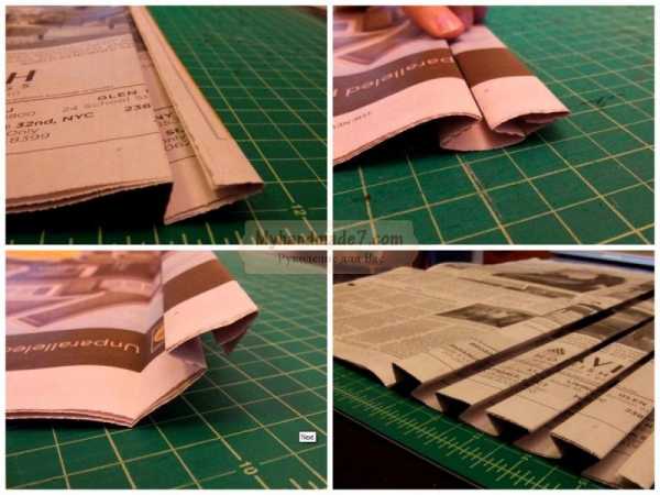 На рабочей поверхности следует развернуть лист газеты полностью, сложить их по две штуки и выполнить плиссировку на каждой паре. Первую складку выполняем, отступив полтора сантиметра от края, вторую – шириной 2,5 см. затем перевернуть и сделать складку таким образом, чтобы ее сгиб был посередине предыдущей, впритык с первой. Далее переворачиваем и выполняем загиб отступив 2,5 см, ширина складки должна быть 1,25 см, а шов будет касаться предыдущей складки. Закончить плиссировку на этом листе и таким же образом сделать еще на трех листах, всего у нас должно получиться четыре плиссированных части.