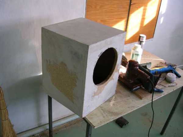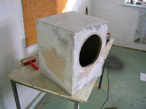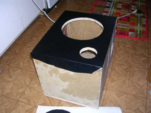 Стенки сабвуфера своими руками сделаны из ДСП, толщиной 20 мм. Скреплял с помощью саморезов длиной 50 мм. Все места соединения стенок дополнительно посадил на клей ПВА (мой совет — лучше не жалеть клея и намазать больше чем надо, лишнее все равно выдавится, а прочности заметно добавится). Для большей надежности все швы внутри я промазал бесцветным силиконовым герметиком. Ниже фото сабвуфера в процессе изготовления.